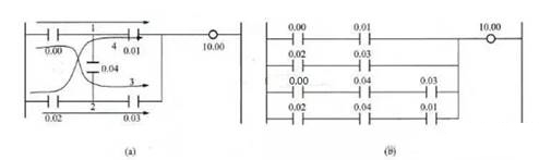 (5)、梯形图程序必须符合顺序执行的原则,即从左到右,从上到下地顺序执行,如不符合顺序执行原则的梯形图程序是无法输入编程软件的。如图4(a)所示的桥式结构的梯形图,不难看出程序设计者的意图是,当支路l的所有触点均闭合、或支路2的所有触点均闭合、或支路3的所有触点均闭合、或支路4的所有触点均闭合时,线圈10.00被驱动得电。但此类梯形图由于不符合编程规则而无法输入编程软件或手持编程器,应将图4(a)转换成图4(b)所示,才能利用编程软件或手持编程器写入PLC存储器中。