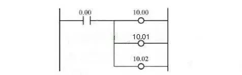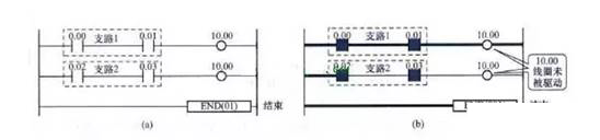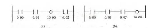 电路中,触点可以加在线圈的右边,这在PLC的梯形图中是不允许的。如图1(a)表示。从图中不难看出编程者的意图是,当触点0.00、0.01、0.02都闭合时,线圈10.00被驱动得电。但在梯形图中由于触点不能与右母线相连,因此将图1(a)转换成图1(b)所示格式,既满足了程序的上述功能,又符合梯形图的编程规则。
