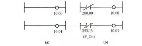 (3)、线圈不能直接与左母线相连。由图2(a)不难看出编程者的意图是,使程序一运行10.00、10.01线圈即被驱动。要达到这样的目的,可以使用一个程序中未被调用的内部继电器(如200.00)的常闭触点或者特殊继电器253.15(常通继电器)的常开触点来驱动它们,既满足了编程者的功能要求,又不违背梯形图编程规则,如图2(b)所示。