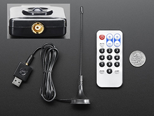 图 2:1497 是一款低成本 SDR 接收器,其封装只有 25 美分硬币大小,并配备辅助天线和遥控器。该接收器可从 24 MHz 调至 1.85 GHz,并通过 USB 与主机连接。(图片来源:Adafruit Industries)