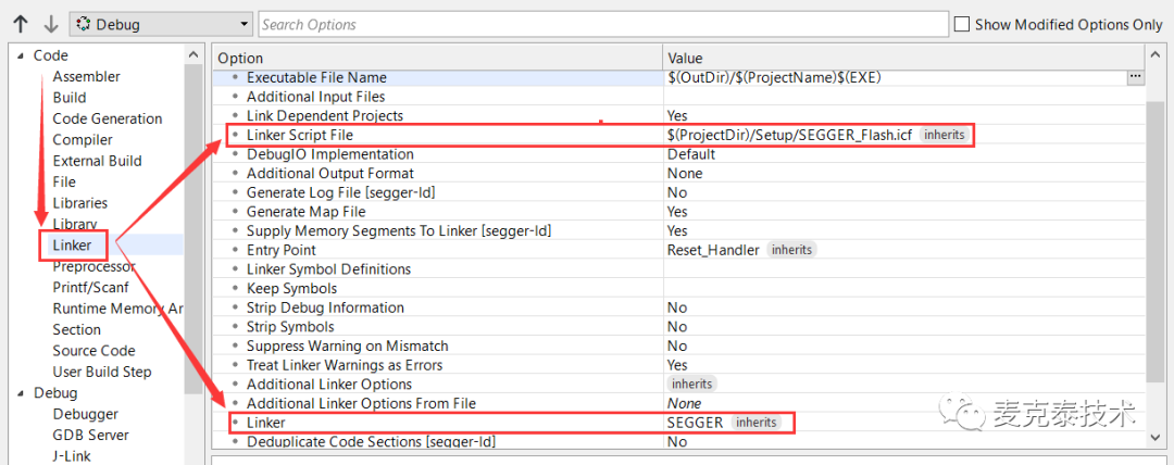 3、将项目选项中的链接器选项的Linker设置为“SEGGER”。