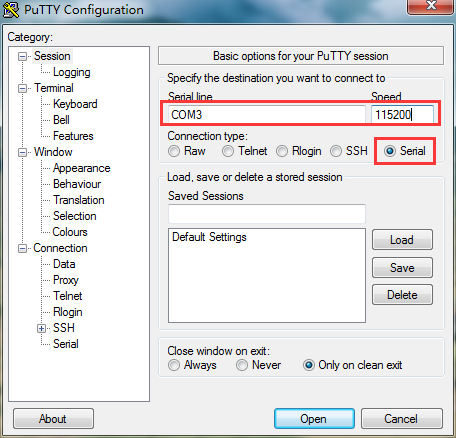 17)选择Serial,Serial line填写COM3,Speed填写115200,COM3串口号根据设备管理器里显示的填写,点击“Open”
