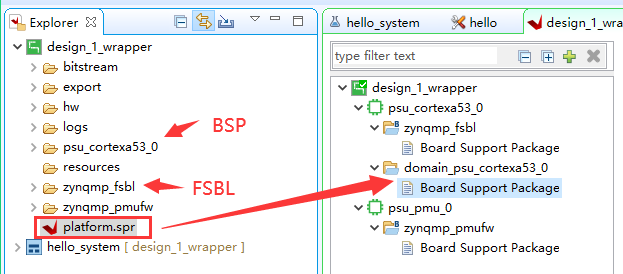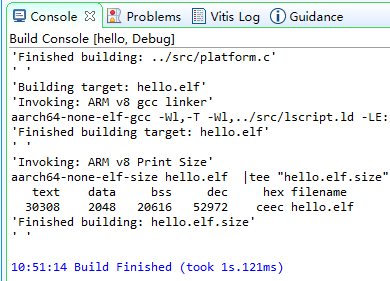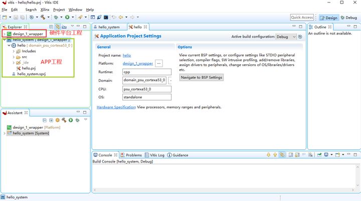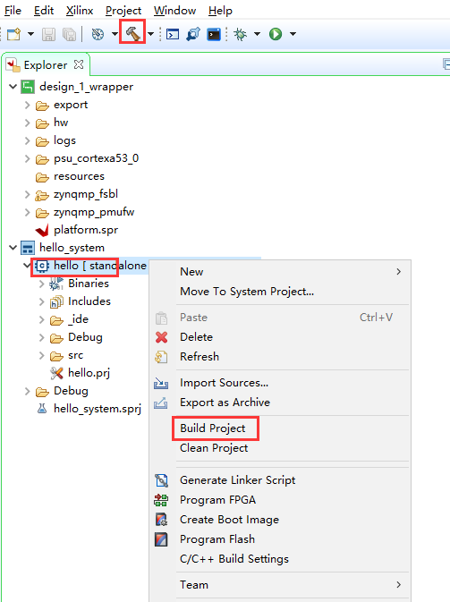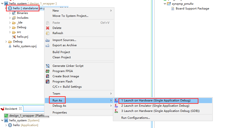 19)给开发板上电,准备运行程序,开发板出厂时带有程序,这里可以把运行模式选择JTAG模式,然后重新上电。选择“hello”,右键,可以看到很多选项,本实验要用到这里的“Run as”,就是把程序运行起来,“Run as”里又有很对选项,选择第一个“Launch on Hardware(Single Application Debug)”,使用系统调试,直接运行程序。