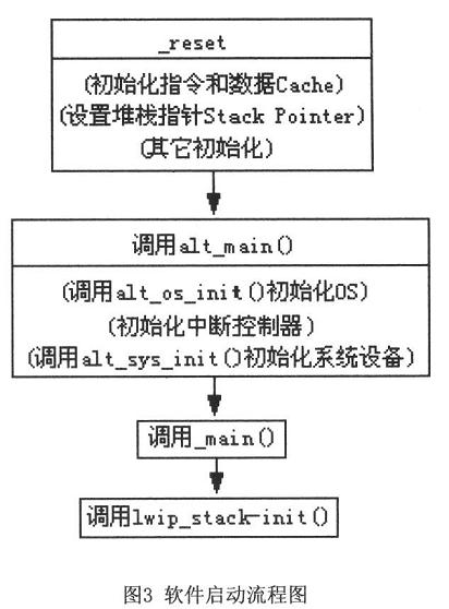 程序先对CPU进行初始化,其功能包括初始化指令和数据Cache,设置堆栈指针(stack Pointer)等,然后调用“alt main()”函数。