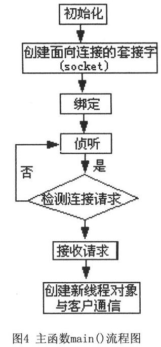 主函数“main()”负责进行网络监听,响应终端的TCP连接请求。若同时要求能与多个终端建立TCP连接和传输数据,需要为每个终端的网络数据处理都开辟一个新的线程,主函数的流程如图4所示。