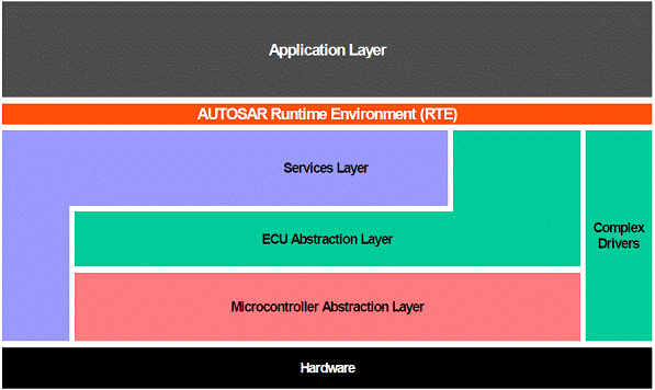 为了区别软件依赖和硬件依赖,基础软件分为四个层次:服务层(Services Layer)、ECU抽象层(ECU Abstraction Layer)、微控制器抽象层(Microcontroller Abstraction Layer)和RTE(Runtime Environment)。除此四层外,在AUTOSAR软件架构中还有复杂驱动(Complex Driver),由于对复杂传感器和执行器进行操作的模块涉及到严格的时序问题,在AUTOSAR中这部分没有被标准化。