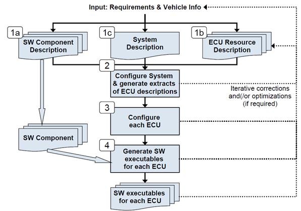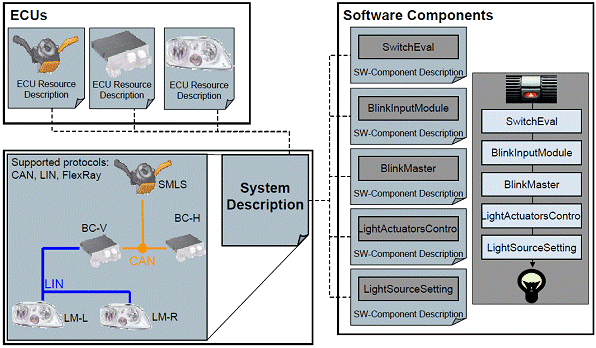 * 可用的硬件:微控制器,架构(如多处理器);内存,接口(CAN,LIN,MOST,FlexRay),外设(传感器/执行器),连接(如引脚数目)。