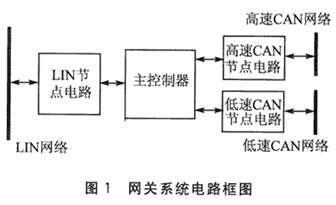 在实际的汽车电子网络中,A、B、C三类网络并不是完全独立的。为了完成车辆的控制及信息共享,不同网络间必须进行相应的数据交换。由于是三种不同的网络,它们之间的通信是不能直接进行的,而必须作相应的协议转换及数据处理后才能实现,这些工作是由网关来实现的。本文提出了一种网关的设计方案,用以实现高速CAN、低速CAN及LIN三种总线网络之间的通信。