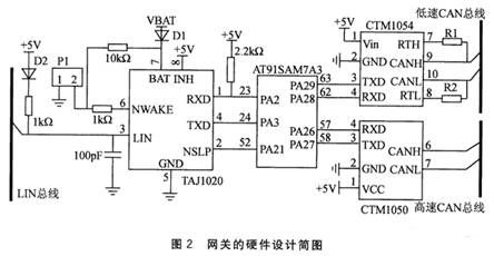 AT91SAM7A3为网关的主控制芯片,TJA1020为LIN总线收发器,CTM1054为低速CAN收发器,CTM1050为高速CAN收发器。