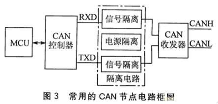 常用的 CAN节点电路如图3所示,它主要由MCU、CAN控制器及CAN收发器组成。为了增强电路的抗干扰性,还需要在控制器与收发器之间增加一个隔离电路。