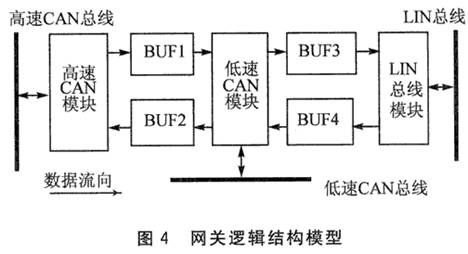 当高速CAN网络上有数据需要接收的时候,通过高速CAN模块接收数据,对接收到的数据进行处理后,将其存到缓冲区BUF1中,再由低速CAN模块将其发送到低速CAN网络上;当LIN网络上有数据需要接收时,通过LIN总线模块接收数据,对接收到的数据进行数据格式转换(LIN格式的报文帧转换为CAN 格式的报文帧),再将其存入到缓冲区BUF4中,并由低速CAN模块将其发送到低速CAN网络上;当低速CAN网络上有数据需要接收时,先接收数据,然后判断数据是发送到高速CAN总线,还是发送到LIN总线,根据判断结果对数据进行处理,存入相应的缓冲区(如数据是发往高速CAN总线,则存入BUF2,否则存入BUF3)。