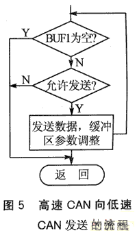 数据的发送由发送子程序完成,网关中主要有3个发送子程序,分别对应两路CAN 控制器以及一路 LIN发送器。高速CAN的发送子程序负责发送BUF1中的数据,LIN的发送子程序负责发送BUF3中的数据,低速CAN的发送子程序负责发送BUF2 和BUF4中的数据。数据的发送采用查询总线状态的发送方式:查询总线的忙闲情况,如果总线忙,则退出发送子程序,进行其他的工作;如果总线空闲,则发送数据。发送完1帧数据后,再检查与之相应的缓冲区的状态。如果为空,则退出发送子程序;如果非空,则再检查总线的忙闲状态。如果忙,则退出发送子程序;如果空闲,则发送数据。然后再开始新一轮的数据查询发送过程。图5为高速CAN向低速CAN发送的流程,其他的发送子程序过程与此类似。