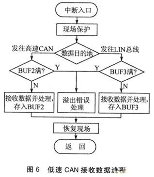 数据接收是从总线上接收数据,进行必要的协议转换,再将转换后的数据存人相应的缓冲区。网关中有3个接收子程序,分别对应两路CAN控制器及一路LIN发送器。数据接收采用中断方式,由于不同网络有不同的实时性要求,因此为3个接收程序设定了不同的中断级别。高速CAN的实时性要求最高,中断级别也设为最高;而LIN总线的实时性在三者中最低,故中断级别也最低。当一个接收中断发生后,进入接收中断子程序,判断相应的缓冲区是否已满(低速CAN的接收程序在接收到数据后需要根据数据的目的网络确定缓存区为BUF2还是BUF3)。如果缓冲区已满,则产生一个溢出错误标志;如果没有满,则将数据进行相应的协议转换,并将转换后的数据存入相应的缓存区,退出中断并完成接收。图6所示为低速CAN数据接收过程的简要流程。