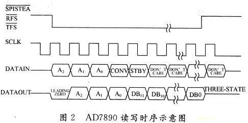 控制AD7890的转换开始有两种方法。一是,硬件控制,即将CONVST引脚置低,器件产生一个窄低电平脉冲,在脉冲的上升沿A/D转换开始,前提是须向CONV位写0;二是,软件控制,即向控制寄存器的cONV位写1,此时CONVST引脚不起作用。二者区别在于,采用硬件控制转换开始时,在CONVS丽上升沿启动转换,此时必须保证内部延时脉冲已经结束;对于软件控制,内部延时脉冲结束时转换立即开始。需要说明的是,在向控制寄存器写数据时,6个写操作时钟脉冲结束前,发送帧同步信号TFS必须保持低电平,否则写操作不能成功。而读取A/D转换结果期间,接收帧同步信号RFS必须保持低电平。RFS和TFS连在一起,使SPI口的读、写操作同时进行。以DSP作为主设备,AD7890作为从设备,即工作在外部时钟模式下,此时读、写操作时序分别如图2所示。DSP的SPISTE丽引脚具有从设备片选功能,该引脚为低时可向从设备发送数据,文中将该引脚作为通用收、发帧同步信号来控制RFS和TFS。
