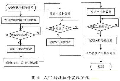 对于SPI接口而言,数据与串行时钟脉冲是同时产生的,即只有数据线上有数据传送时才产生时钟脉冲。所以发送控制数据结束后,DSP收到的数据并不是真实的A/D转换结果,但需要读取接收缓冲寄存器数据使SPI复位。多次实验表明,对于单次A/D转换,在转换结束后需要再向AD7890发送2次空控制数据0x0000,之后DSP的SPI接收缓冲寄存器中的数据才是正确的A/D转换结果,即每次A/D采样循环需要进行三次数据交换才能得到有效A/D转换数据。采用查询方式判断数据是否发送结束,即SPI状态寄存器SPIINT FLAG位为1时表示已完成数据发送。软件实现A/D转换的流程框图如图4所示。