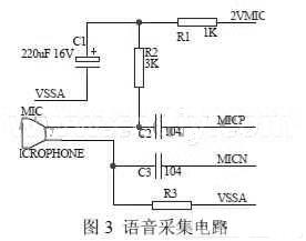 由于SPCE061A的MIC-IN通道内部做了AGC自动增益和滤波处理,语音的采集只需一个驻极话筒和少量的外围阻容电路即可。相关电路如图3所示。