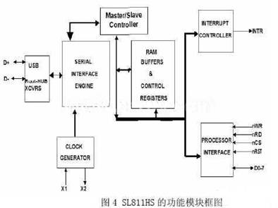 USB主机接口芯片采用的是Cypress公司的SL811HS,它是一款嵌入式的USB主、从控制器芯片,它可以实现USB主机结构中的总线接口层的功能。其功能模块框图如图4所示。SL811HS内部的串行接口引擎实现了主机与总线上数据的并串转换任务。USB主机的端点也是这个芯片上的部分寄存器,主机通过向这些端点写数据,就可以将这些数据直接转换为USB总线上的差模二进制数据,或者接收总线上的差模二进制数据,并存入端点寄存器,供主机取用。