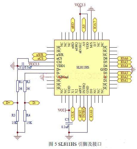 由于系统只实现USB主机的功能,所以将控制SL811HS的主/从机工作方式的M/S管脚直接接地,使USB接口工作在主机方式。其中SL811HS的A0功能较为灵活,它为低电平时表示数据线上的数据是SL811HS的RAM空间的地址指针。而紧接着置位A0实现读写指定地址的RAM中数据,从而实现数据的传输。SL811HS支持地址自增模式,即可以将连续地址单元中的内容读出传送,而不用再次写入地址指针,从而大大的提升数据传输的有效率。图5为SL811HS的外围电路及引脚定义。