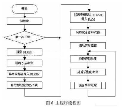语音的识别首先需要将待识别的命令特征存入语音识别模板库,然后才是对相应命令的辩识。这一部分的程序是在主程序中处理的,其流程如图6 所示。
