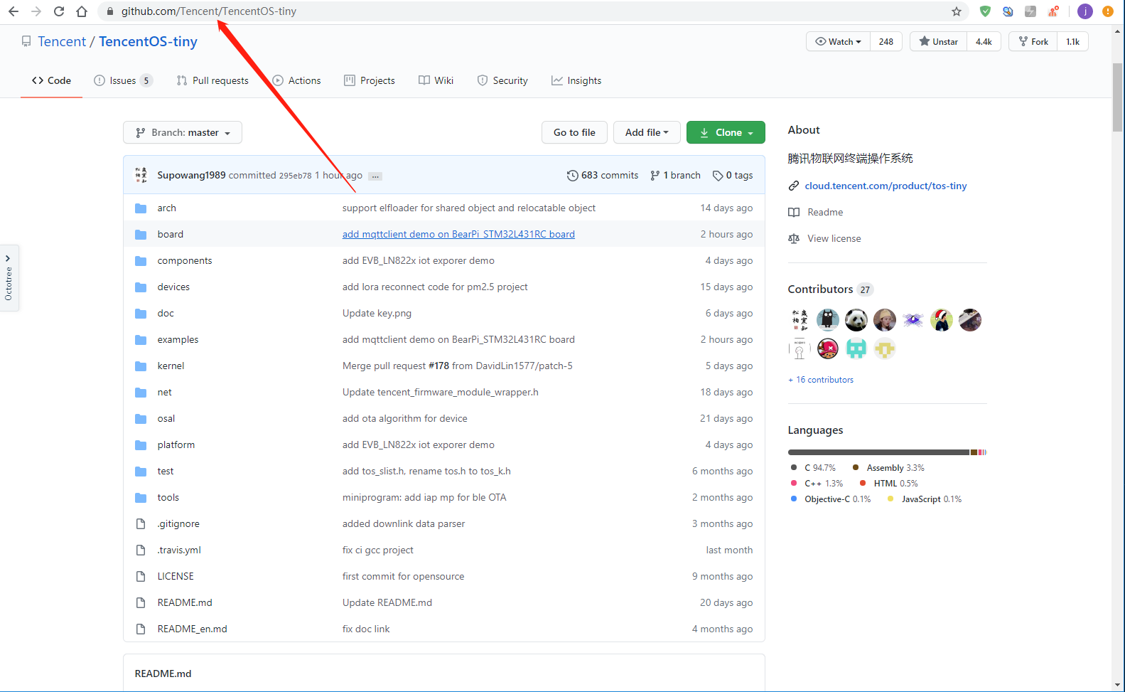 我们可以将TencentOS tiny官方仓库拉取到你的电脑上,地址是:https://github.com/Tencent/TencentOS-tiny