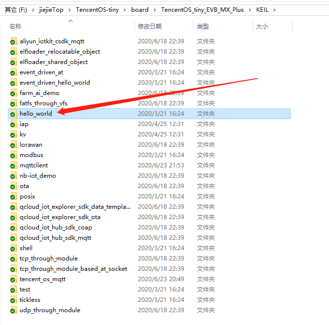 然后选择一个TencentOS_tiny_EVB_MX_Plus开发板的hello world例程就好了,当然这里面已经有移植完毕的mqttclient例程,我们现在是学习移植过程,就选个helloworld就好了。