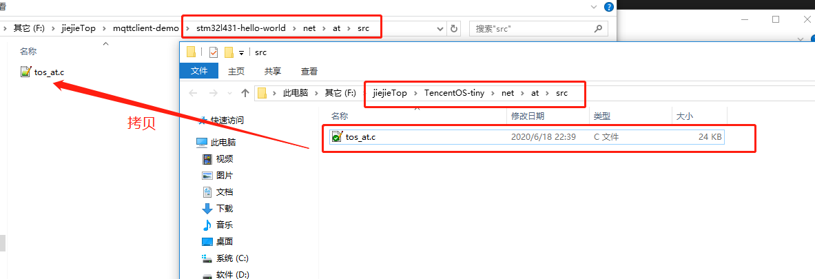 - 在工程中创建一个文件夹,路径如下:netatsrc,然后将TencentOS-tinynetatsrc路径下的tos_at.c拷贝到新建的文件夹目录下: