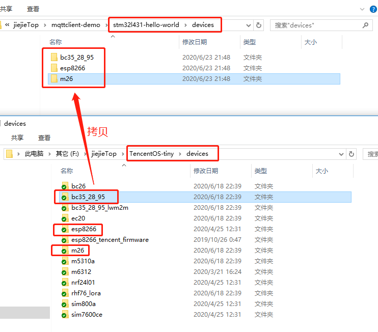 - 在工程中创建一个devices文件夹,然后将TencentOS-tinydevices路径下的bc35_28_95文件夹与esp8266文件夹以及m26文件夹拷贝到新建的文件夹目录下: