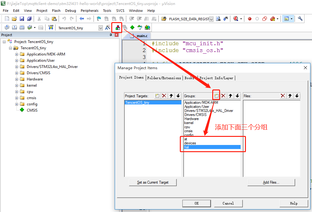 - 打开工程,添加at、devices、hal三个分组,具体操作如下: