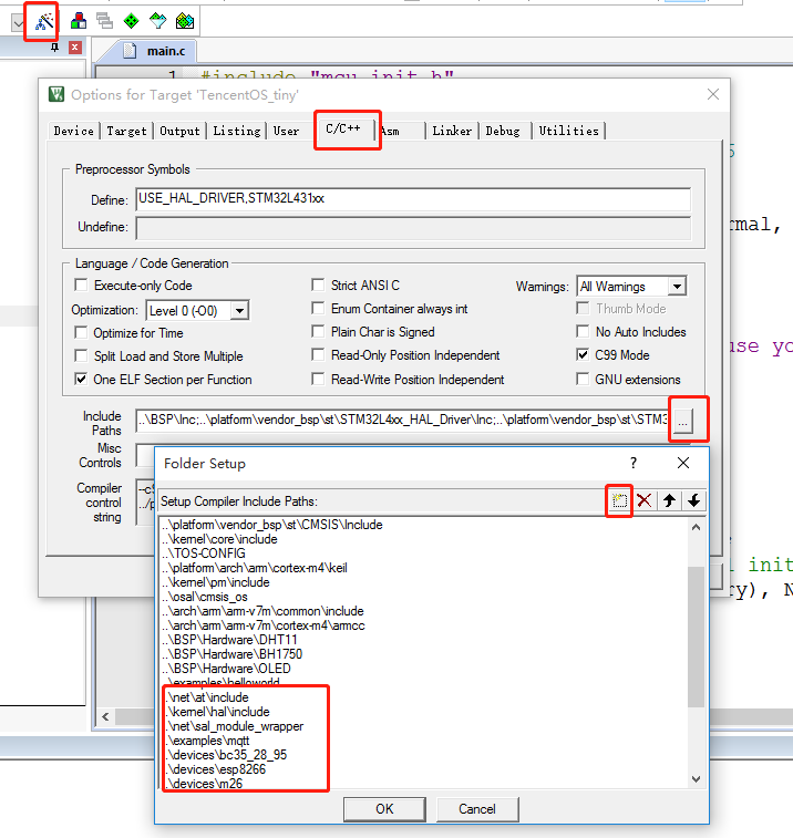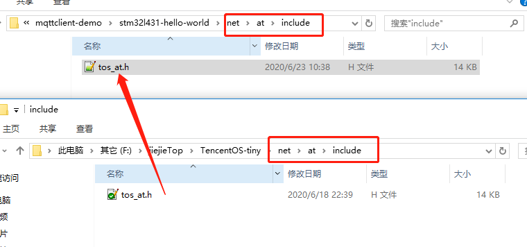 - 拷贝at框架的头文件,在工程目录下创建以下路径的文件夹netatinclude,将TencentOS-tinynetatinclude路径下的tos_at.h文件拷贝到新建的文件夹目录下: