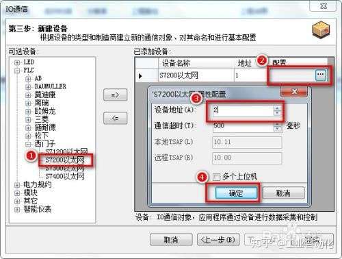 3、新建设备-在 PLC 中选择【西门子—S7200 以太网】,填入设备名称;【设备地址】填入 PLC 的站地址。