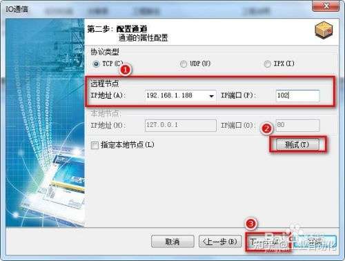 2、配置通道-远程节点中【IP 地址】填入模块的 IP 地址,【IP 端口】填入 102,点击【测试】,完成配置;