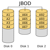 这里要提一下 JBOD ( Just a Bunch of Disks )。最初 JBOD 用来表示一个没有控制软件提供协调控制的磁盘集合,这是 RAID 区别与 JBOD 的主要因素。目前 JBOD 常指磁盘柜,而不论其是否提供 RAID 功能。