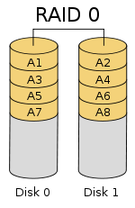 RAID0 是一种简单的、无数据校验的数据条带化技术。实际上不是一种真正的 RAID ,因为它并不提供任何形式的冗余策略。 RAID0 将所在磁盘条带化后组成大容量的存储空间(如图 2 所示),将数据分散存储在所有磁盘中,以独立访问方式实现多块磁盘的并读访问。由于可以并发执行 I/O 操作,总线带宽得到充分利用。再加上不需要进行数据校验,RAID0 的性能在所有 RAID 等级中是最高的。理论上讲,一个由 n 块磁盘组成的 RAID0 ,它的读写性能是单个磁盘性能的 n 倍,但由于总线带宽等多种因素的限制,实际的性能提升低于理论值。