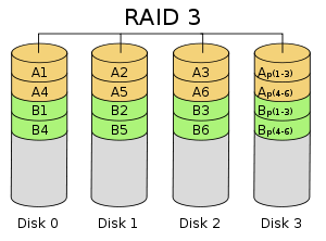 RAID3 (图 5 )是使用专用校验盘的并行访问阵列,它采用一个专用的磁盘作为校验盘,其余磁盘作为数据盘,数据按位可字节的方式交叉存储到各个数据盘中。RAID3 至少需要三块磁盘,不同磁盘上同一带区的数据作 XOR 校验,校验值写入校验盘中。 RAID3 完好时读性能与 RAID0 完全一致,并行从多个磁盘条带读取数据,性能非常高,同时还提供了数据容错能力。向 RAID3 写入数据时,必须计算与所有同条带的校验值,并将新校验值写入校验盘中。一次写操作包含了写数据块、读取同条带的数据块、计算校验值、写入校验值等多个操作,系统开销非常大,性能较低。