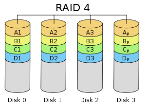 RAID4 在不同磁盘上的同级数据块同样使用 XOR 校验,结果存储在校验盘中。写入数据时, RAID4 按这种方式把各磁盘上的同级数据的校验值写入校验 盘,读取时进行即时校验。因此,当某块磁盘的数据块损坏, RAID4 可以通过校验值以及其他磁盘上的同级数据块进行数据重建。