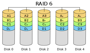 RAID6 不仅要支持数据的恢复,还要支持校验数据的恢复,因此实现代价很高,控制器的设计也比其他等级更复杂、更昂贵。 RAID6 思想最常见的实现方式是采用两个独立的校验算法,假设称为 P 和 Q ,校验数据可以分别存储在两个不同的校验盘上,或者分散存储在所有成员磁盘中。当两个磁盘同时失效时,即可通过求解两元方程来重建两个磁盘上的数据。