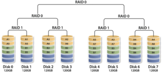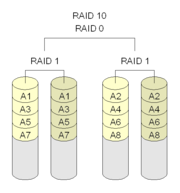 标准 RAID 等级各有优势和不足。自然地,我们想到把多个 RAID 等级组合起来,实现优势互补,弥补相互的不足,从而达到在性能、数据安全性等指标上更高的 RAID 系统。目前在业界和学术研究中提到的 RAID 组合等级主要有 RAID00 、 RAID01 、 RAID10 、 RAID100 、 RAID30 、 RAID50 、 RAID53 、 RAID60 ,但实际得到较为广泛应用的只有 RAID01 和 RAID10 两个等级。当然,组合等级的实现成本一般都非常昂贵,只是在 少数特定场合应用。