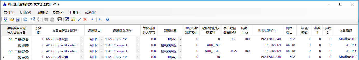 02是读取ModbusTCP设备的数据到AB的PLC,AB的PLC里面定义了名称为‘ARR_REAL’的32为浮点数数组,将ModbusTCP设备的400011~400030共20个寄存器40个字节读取到AB的浮点数数组的前10个寄存器。