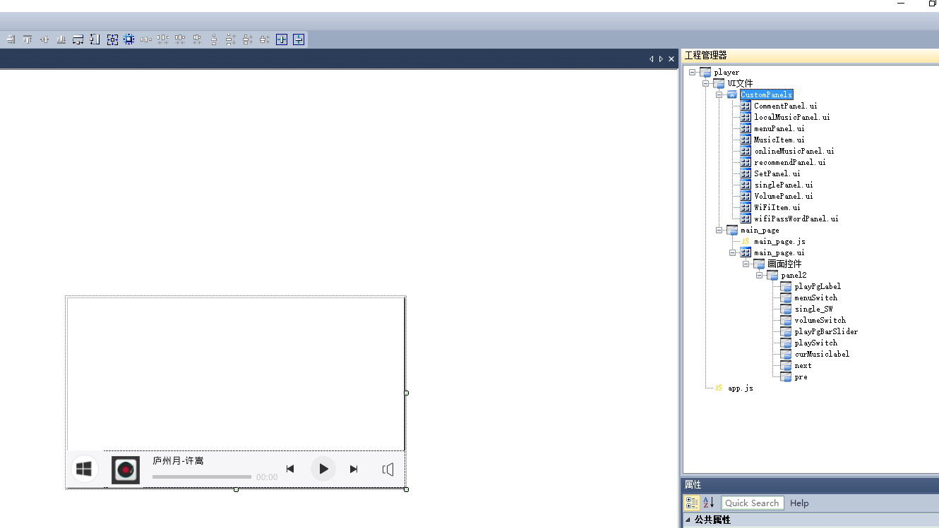 功能和界面都有点模拟网易云音乐,工程只使用了一个page,别的功能区显现、界面切换等等都是使用了自定义面板(这个控件真滴很强),如下所示: