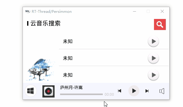 这里由于是仿真,无法使用WIFI,所以无法搜索,使用柿饼派失误是可以实现音乐的搜索的,由于文本输入控件目前只能输入字母、数字等字符,无法输入中文,所以只能选择使用拼音之类的方式搜索。