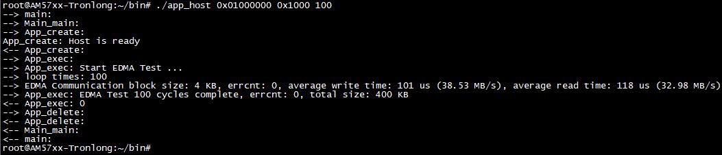 EDMA单次传输数据大小为2KByte(0x800),总共循环100次。如需再次测试读写速度,请重新运行DSP端程序。