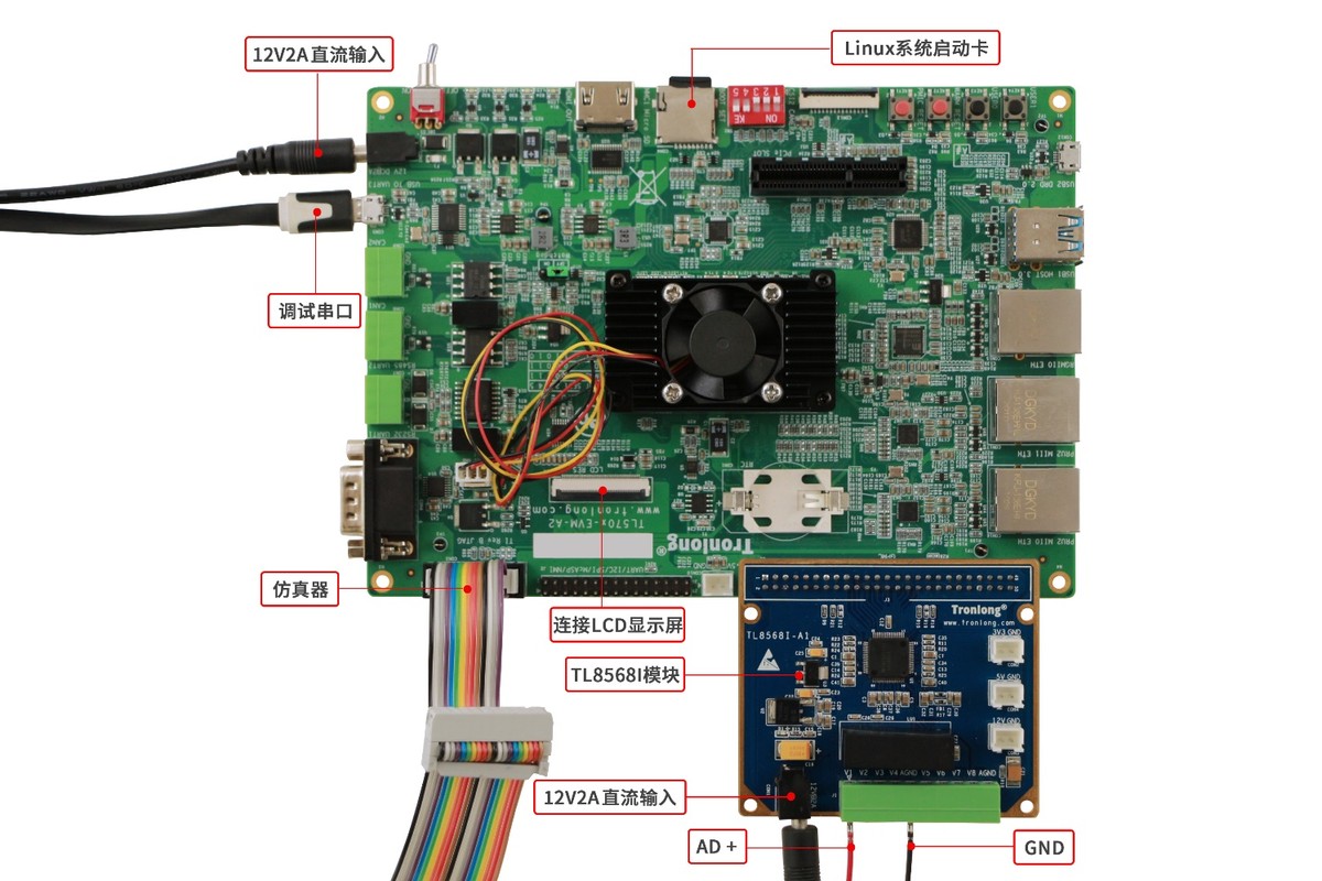 案例测试将Tronlong的TL7606I(AD7606)模块或TL8568I(ADS8568)模块插入评估板GPMC扩展接口,并对模块进行独立供电。TL7606I模块使用5V电源供电,J1跳线帽连接到0,使用±5V量程。TL8568I模块使用12V电源供电,软件已配置为±12V量程。