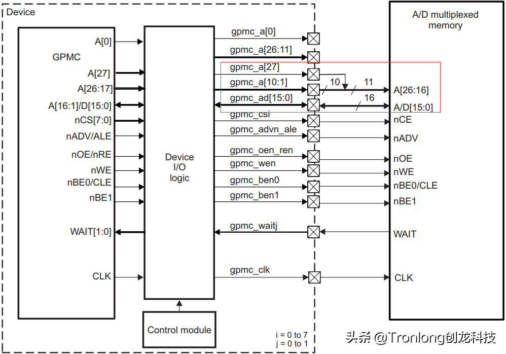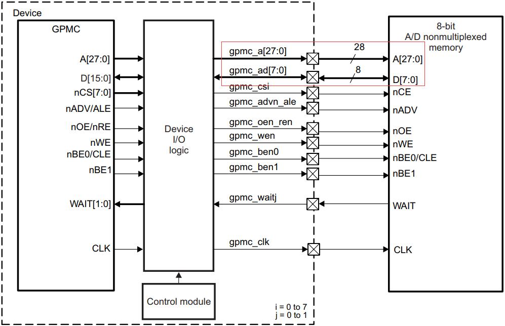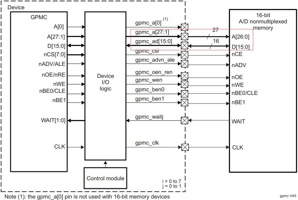 由于有gpmc_ad[15:0] 16个信号引脚可支持地址线与数据线复用和非复用模式,这让GPMC与外设的连接模式变得很丰富,可以和宽范围的外部设备通信,如: