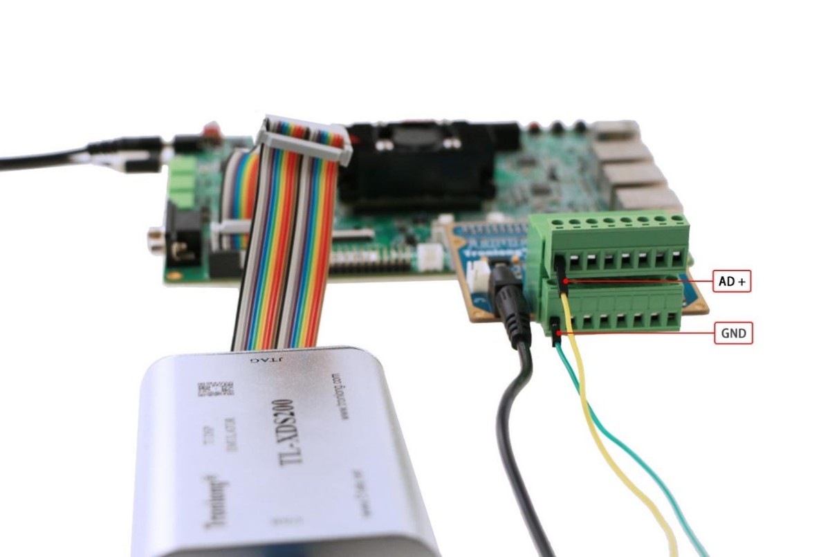案例测试将TL-HSAD-LX采集卡通过TL-HSAD-LX-PinBoard转接板和软排线,插到TL570x-EVM评估板的GPMC拓展接口J5上,并使用5V2A电源给TL-HSAD-LX采集卡供电,硬件连接图如下。