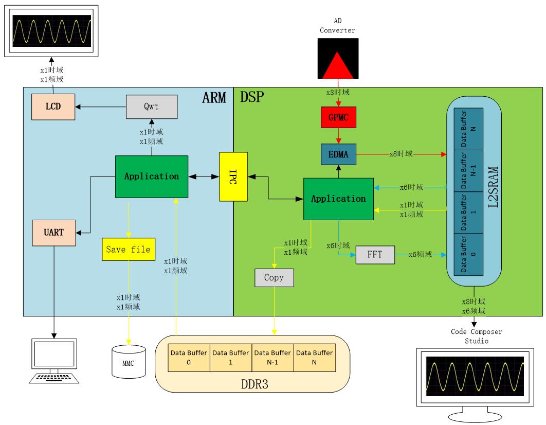 程序保存通道0的时域数据和经FFT处理的频域数据至CMEM(共享内存)空间,通过IPC组件通知ARM端读取该通道的时域数据和频域数据,使用Qt在LCD显示屏上进行波形绘制,最后将数据保存到文件中。