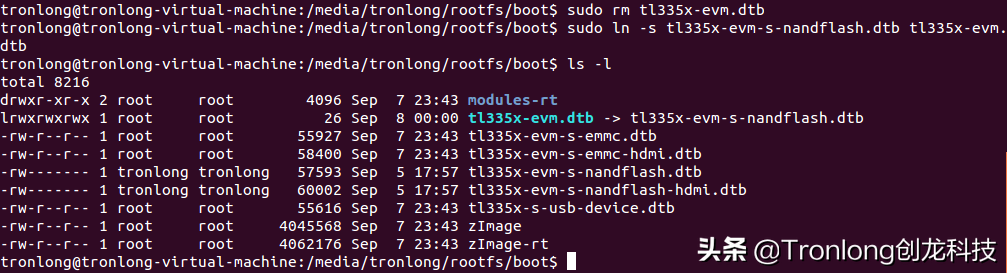 请执行如下命令将tl335x-evm.dtb软链到tl335x-evm-s-nandflash.dtb文件。tl335x-evm-s-nandflash.dtb支持LCD显示,如需使用HDMI显示,则将tl335x-evm.dtb软链到tl335x-evm-nandflash-hdmi.dtb文件即可。