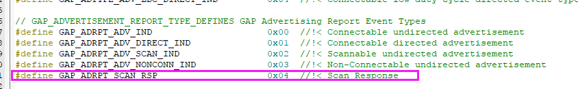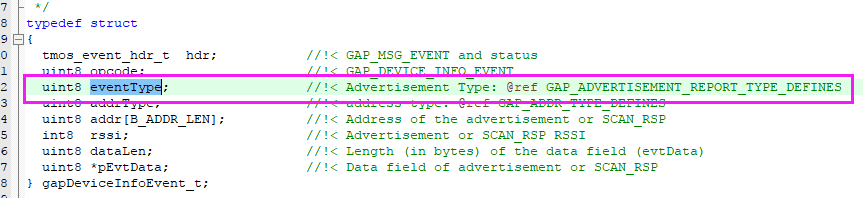 在扫描时候,通过GAP_DEVICE_INFO_EVENT 事件,在下面结构体里面的eventype指示该包的类型