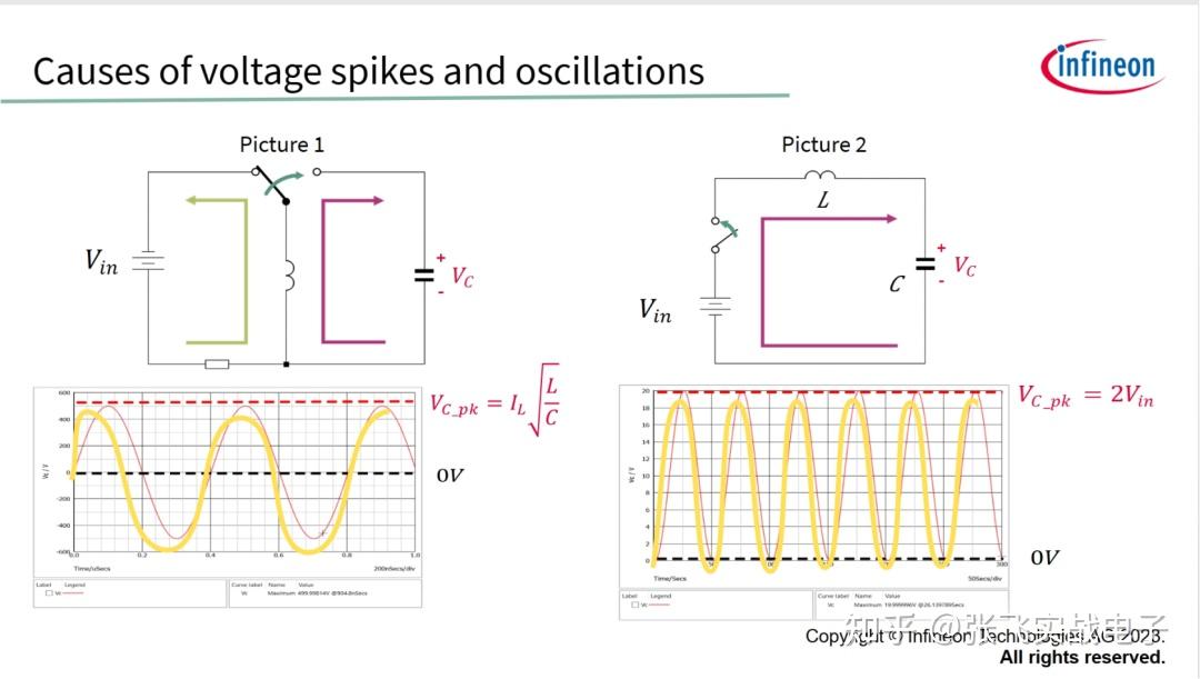 在图1中,当开关状态变化后,电容电压变到这个等级。在图2中,当开关状态变化后,电容电压变到这个等级,当电容器达到第一个峰值电压,就会开始将能量返回电感器和电压源。随后,电能在电感器(电压源)和电容器之间传输,振荡由此而来。