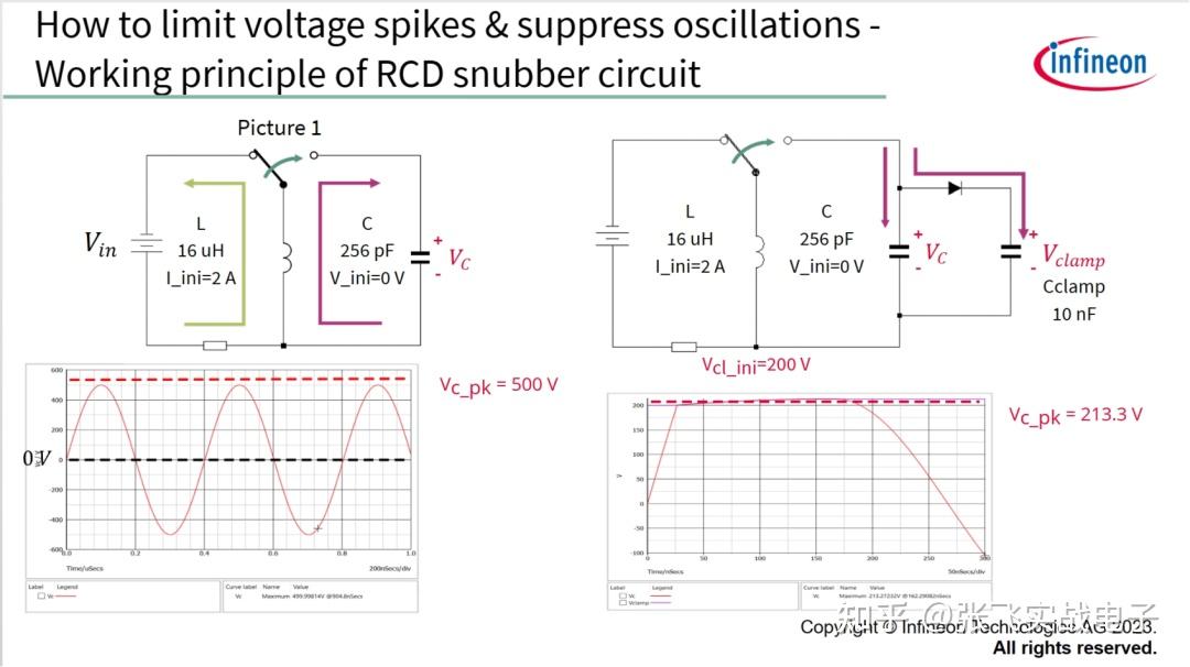 如何限制图1中的峰值电压,抑制振荡呢?通过较大的电容器续流电感器中的电流,可降低电感器峰值电压,例如,用16uH的电感器和2A的初始电流,给256pF的电容器供电,则峰值电压为500V,在右图,增加了一个二极管和较大的10nF电容器,在200V初始电压下,峰值电压可降至213.3V,这就是RCD缓冲电路的工作原理。