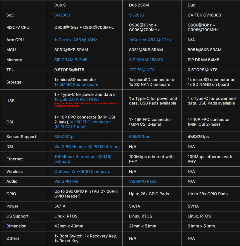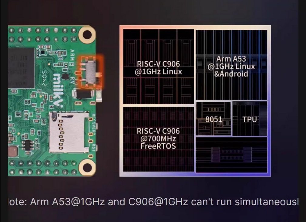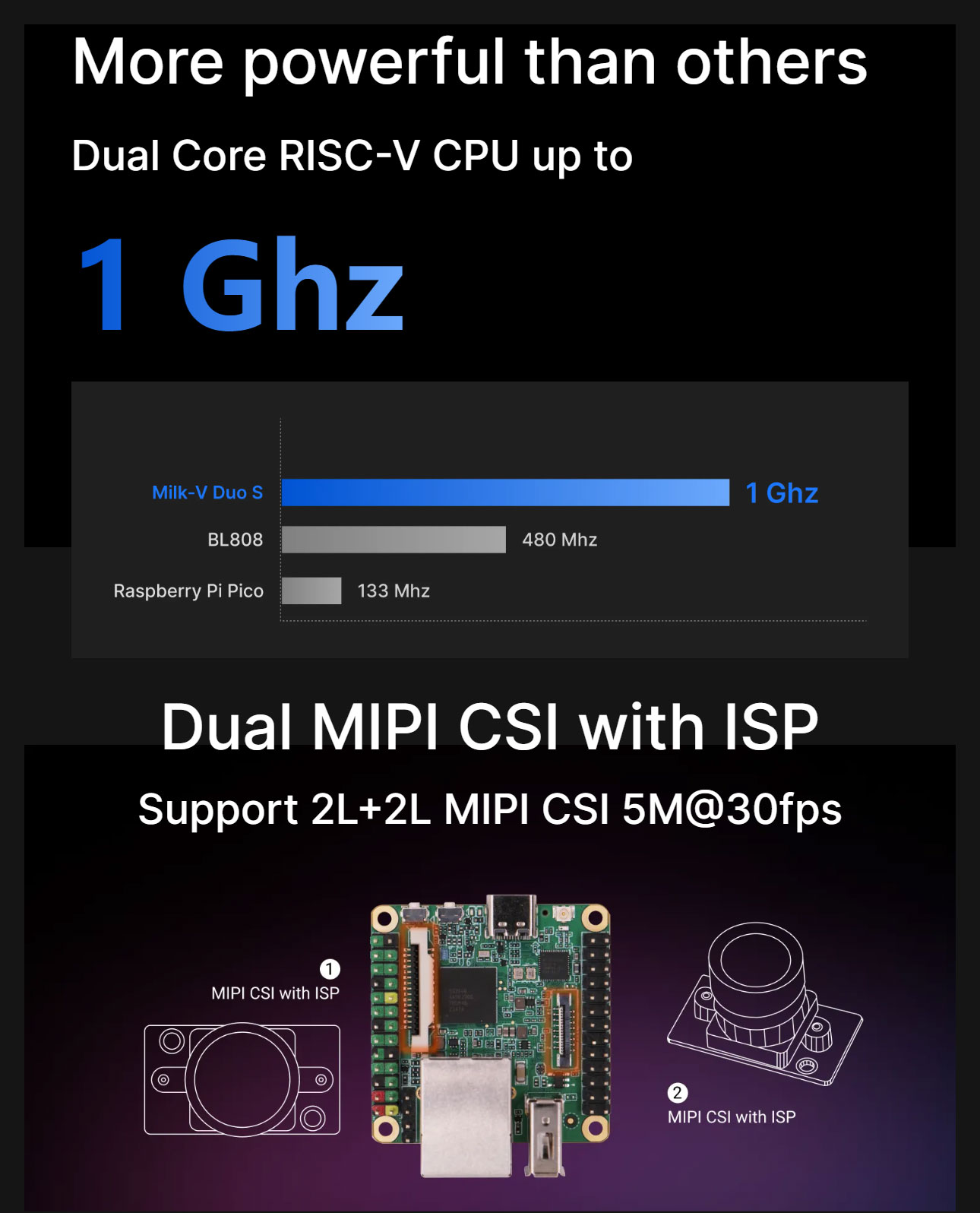 Milk-V Duo S 是 Duo 的升级型号,配备升级版 SG2000 主控制器、更大的 512MB 内存和更丰富的输入/输出功能。它集成了 WI-FI 6/BT 5 无线功能,并配备 USB 2.0 HOST 接口和 100Mbps 以太网端口,方便用户使用。它支持双摄像头(2x MIPI CSI 双通道)和 MIPI 视频输出(MIPI DSI 四通道),应用广泛。该设备还支持通过交换机在 RISC-V 和 ARM 启动模式之间切换。凭借增强的功能,Duo S 能够更好地适应各种项目开发需求更复杂的场景。